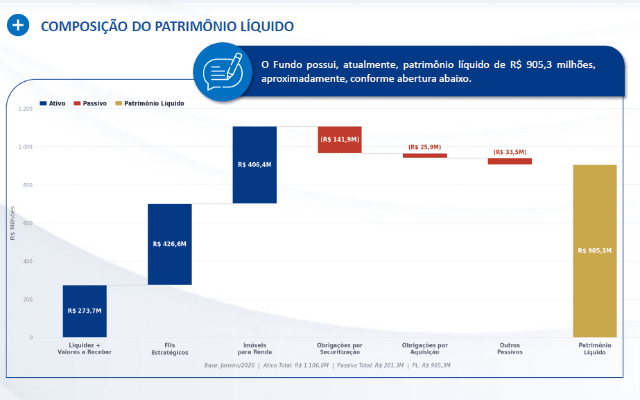 Quando você olha o balanço, isso fica ainda mais claro. São cerca de R$ 1,1 bilhão em ativos, R$ 201 milhões em passivos e um patrimônio líquido de aproximadamente R$ 905 milhões, o que mostra que existe sim uma estrutura de capital que precisa ser acompanhada.