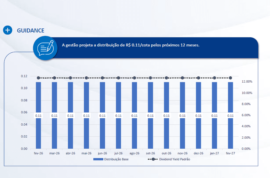 O fundo hoje entrega um dividendo de R$ 0,11 por cota, com um yield mensal próximo de 1,04%. Isso é competitivo e chama atenção de quem busca renda.