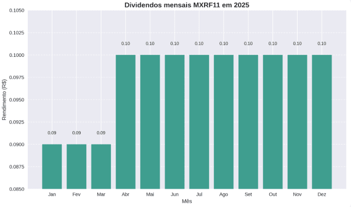 Em 2025, o MXRF11 distribuiu R$0,10 por cota em 9 dos 12 meses. Apenas no primeiro trimestre os dividendos foram de R$0,09. Essa regularidade fez o fundo entregar um yield anualizado de 12,94%, superando o CDI no período.