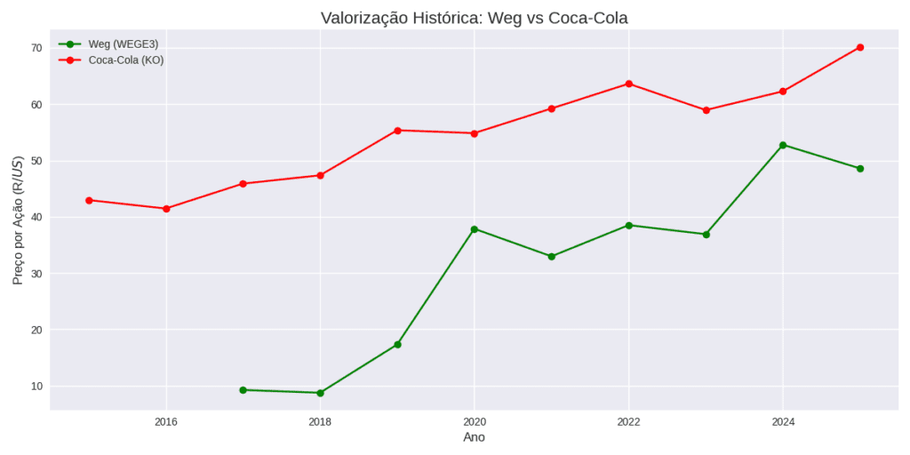 As menções a empresas como WEG3 e Coca-Cola (KO) neste artigo têm fins puramente ilustrativos e educacionais. Não são recomendações de compra. Consulte um profissional para decisões de investimento.