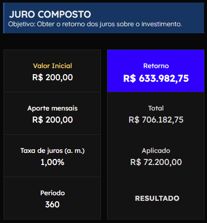 E assim por diante. Começar com apenas R$ 200,00 e manter aportes mensais constantes durante 30 anos, com uma taxa de juros composta de 1% ao mês, pode transformar seu futuro financeiro de forma surpreendente. Como mostra o cálculo, o valor aplicado de R$ 72.200,00 se multiplica para mais de R$ 706 mil, graças ao poder dos juros compostos. Essa estratégia de longo prazo é uma das mais eficazes para quem busca independência financeira com consistência e inteligência.