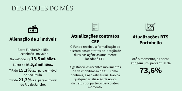 O fundo anunciou a alienação de dois imóveis — Barra Funda/SP e Nilo Peçanha/RJ — por R$ 13,5 milhões, com lucro total de R$ 5,3 milhões, equivalente a R$ 0,034 por cota.