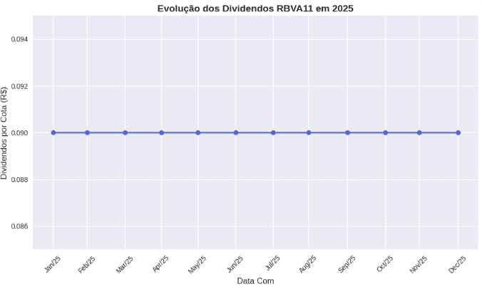 Em 2025, o RBVA11 distribuiu R$0,09 por cota todos os meses, sem falhas ou variações. Essa regularidade é um dos pontos mais valorizados pelos cotistas, especialmente em um cenário de volatilidade econômica.