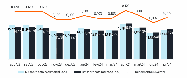 O RURA11 tem mostrado um desempenho sólido ao longo dos meses, mesmo em um mercado instável. Atualmente, o fundo está totalmente alocado, o que significa que ele está utilizando todos os recursos disponíveis para gerar rendimentos. Isso é uma excelente notícia para os cotistas, pois garante que o fundo está operando em sua máxima capacidade. Gestor no relatório gerencial informa: “ORURA11encerrouomêsdejulho de2024com100,2%dopatrimônio alocado em créditoAgro“.
