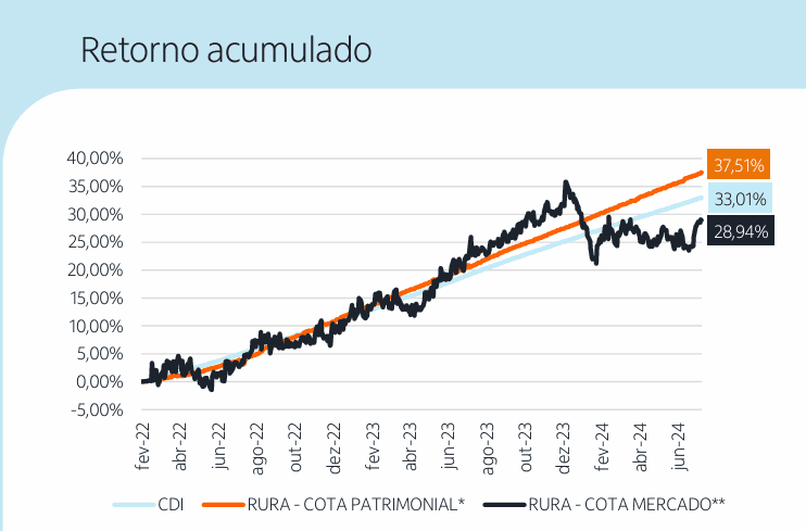 Além disso, o RURA11 já acumula um retorno de 37% desde o seu início, o que é bastante positivo, especialmente considerando o cenário econômico atual. Para os investidores, isso significa que, além de receberem distribuições regulares, eles também estão vendo uma valorização no valor patrimonial de suas cotas.