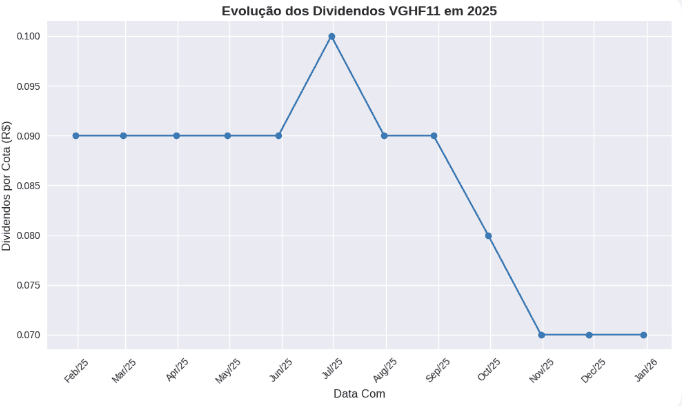 O ano de 2025 começou promissor para o fundo, com distribuições de R$0,09 por cota. Em junho, houve um pico de R$0,10, mas desde então os valores caíram para R$0,09 em julho e agosto, R$0,08 em setembro e R$0,07 em outubro, novembro e dezembro.